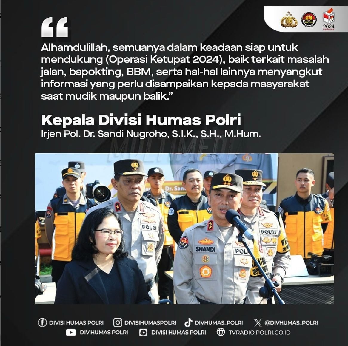 “Polri berkomitmen menjaga kelancaran arus mudik melalui Operasi Ketupat 2024. Mari bersama kita wujudkan mudik ceria dan penuh makna. Selamat hari raya Idul Fitri 1445 hijriah, mohon maaf lahir dan batin.” Ujar Kadiv Humas Polri.