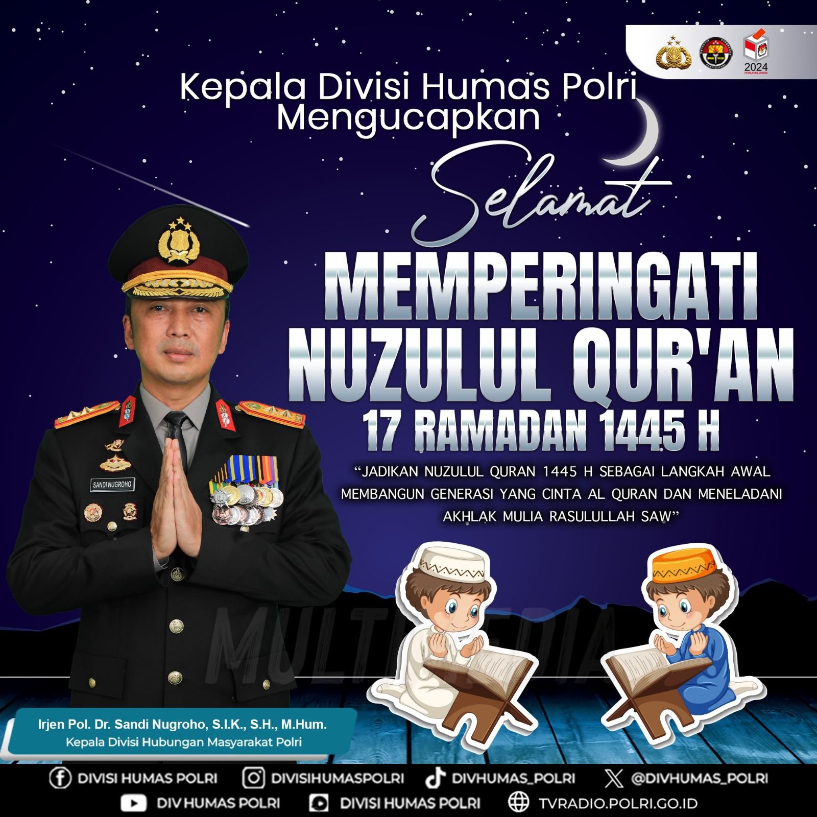 Jakarta – Dalam momen bersejarah peringatan Nuzulul Qur’an 17 Ramadan 1445 H, Kepala Divisi Humas Polri, Irjen Pol. Dr. Sandi Nugroho, S.I.K., S.H., M.Hum., mengucapkan selamat kepada seluruh umat Islam yang merayakan. Beliau menegaskan pentingnya memaknai peristiwa Nuzulul Qur’an sebagai langkah awal dalam membangun generasi yang mencintai Al Qur’an dan meneladani akhlak mulia Rasulullah SAW.