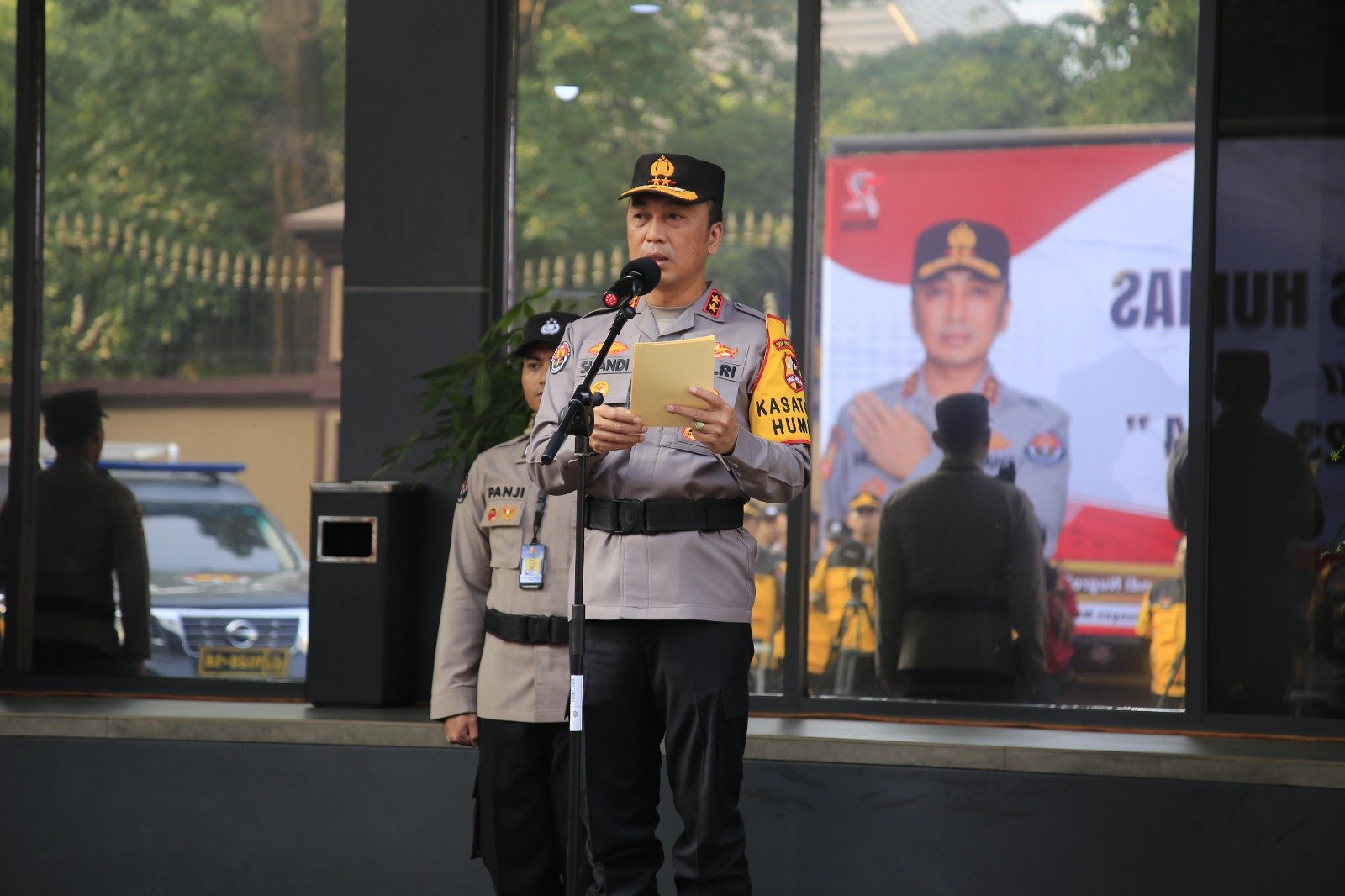 Kadiv Humas Polri, Irjen Pol. Sandi Nugroho, memimpin apel gelar pasukan dalam rangka kesiapan Satgas Humas Ops Mantap Brata 2023, yang bertujuan untuk mengamankan Pemilu 2024.
